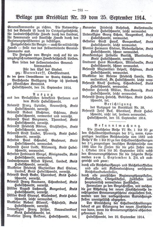 Im September 1914 erschienen die ersten Verlustlisten im Habelschwerdter Kreisblatt